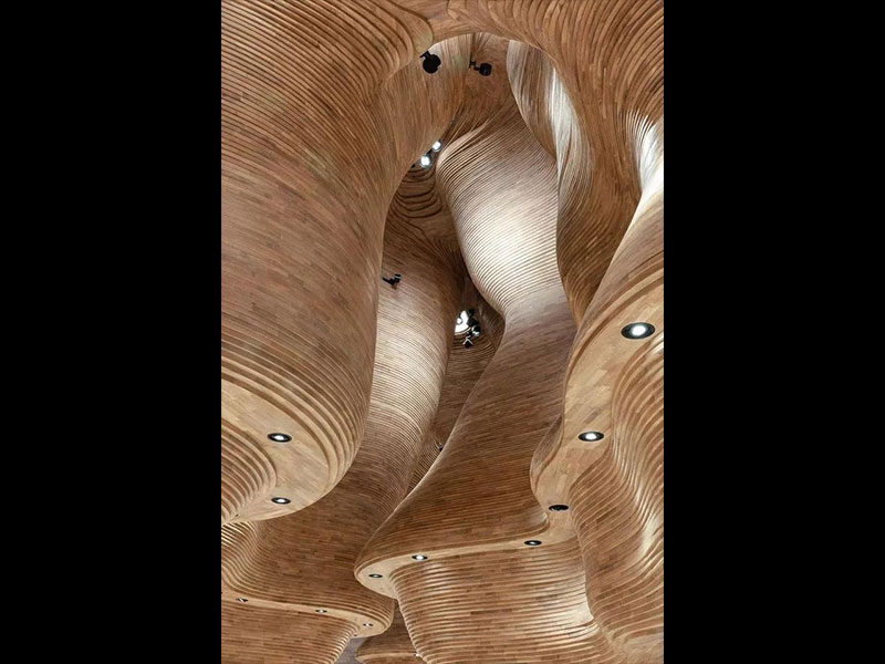 高耸的木墙构成一系列洞穴外壳,整个空间共使用了40000块木材,采用3D建模设计,并在多哈进行手工组装,最终创造一个洞穴般的空间体验,唤起了光之洞的有机形式。试图创造一个蕴含卡塔尔文化的空间,从窄巷到广阔的沙漠景观。